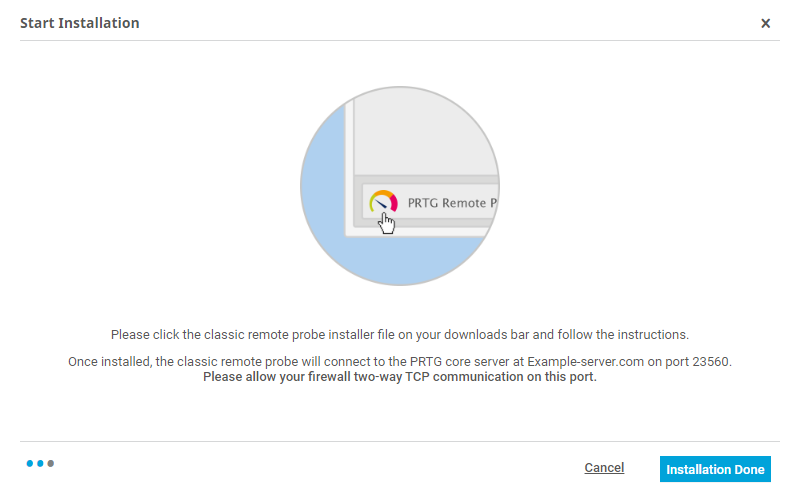 i_square_cyanFor a partially automatic installation of a classic remote probe directly from the device tree in the PRTG web interface, see section Classic Remote Probe Setup via Device Tools. For a quick installation guide, see the Paessler website: How to install a classic remote probe for PRTG Network Monitor in 4 steps.